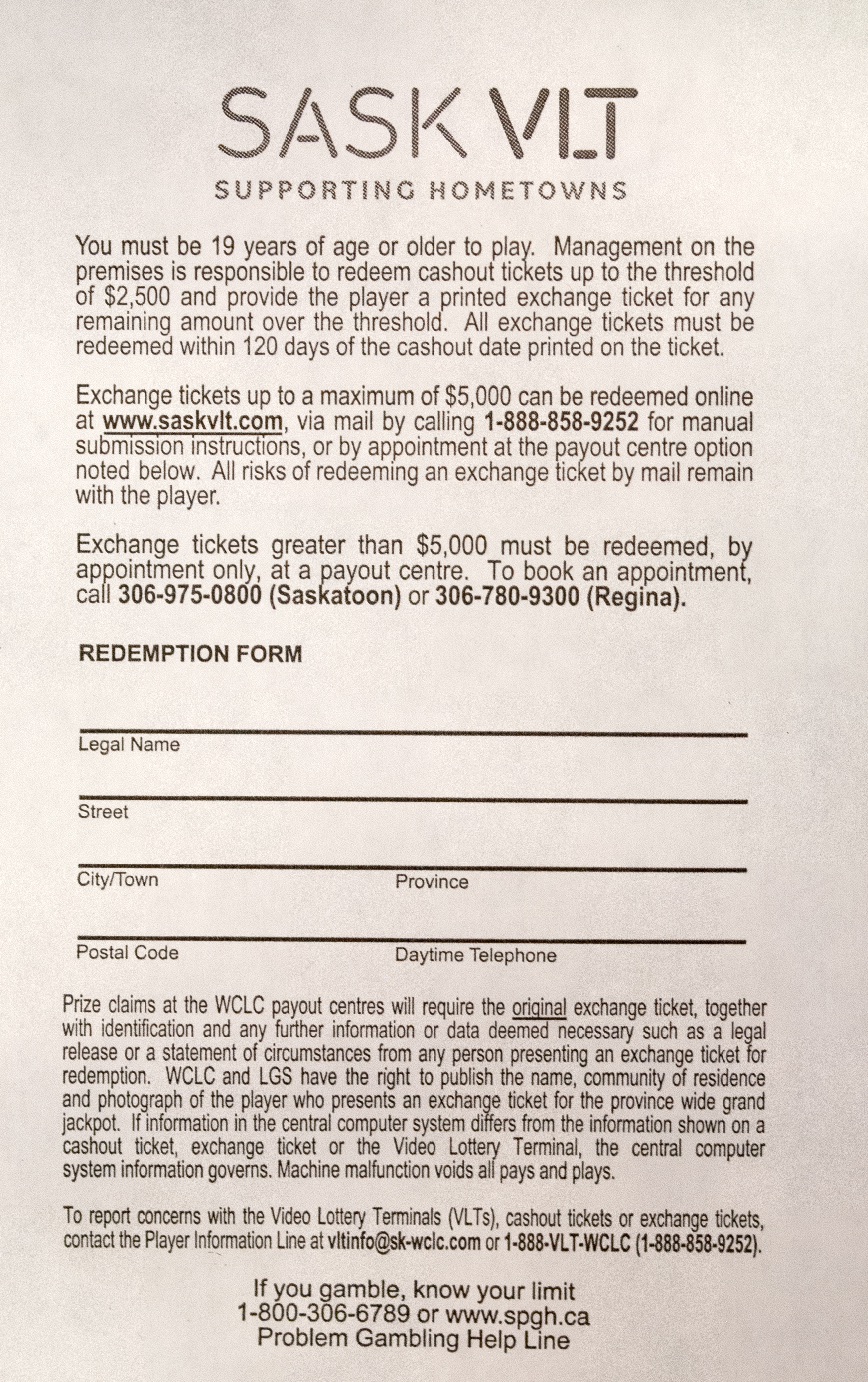 The VLT site where you won will pay cashout tickets up to $2,500 and an exchange ticket is printed to claim the remaining amount. An exchange ticket up to a maximum of $5,000 can be claimed online. Submit all items included in the checklist with your online form. You will receive an email confirmation upon submission and after your claim submission is reviewed and validated, a cheque will be mailed to you.